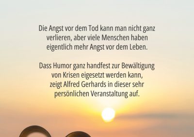 Unter dem Titel „Das Lächeln am Fuße der Bahre“ spricht Alfred Gerhards (Globo) über Sterben, Trauer und die Kraft des Humors. In seinem sehr persönlichen Vortrag zeigt er, wie Humor dabei helfen kann, Krisen zu bewältigen und auch in schwierigen Lebenssituationen neue Perspektiven zu finden.